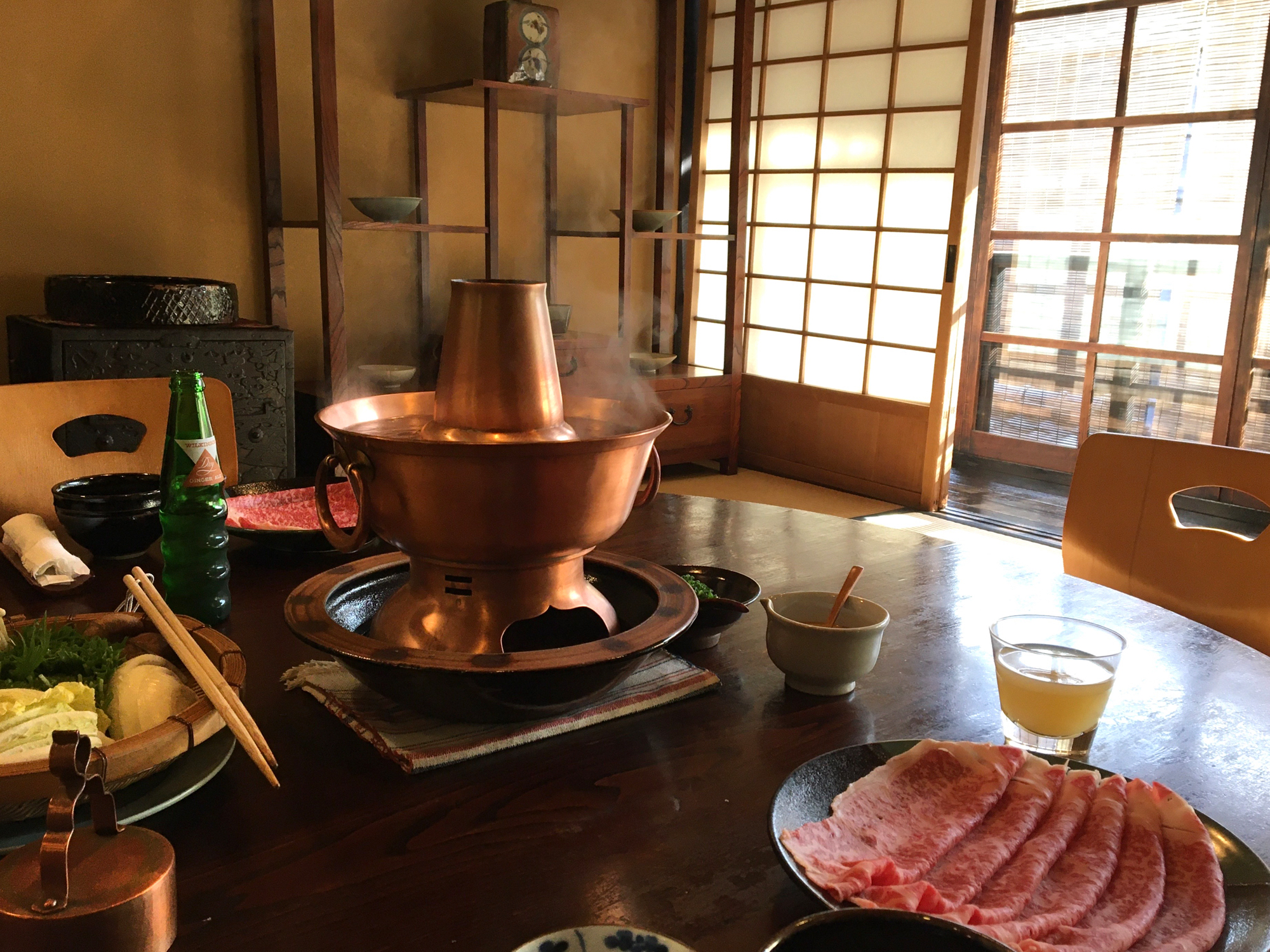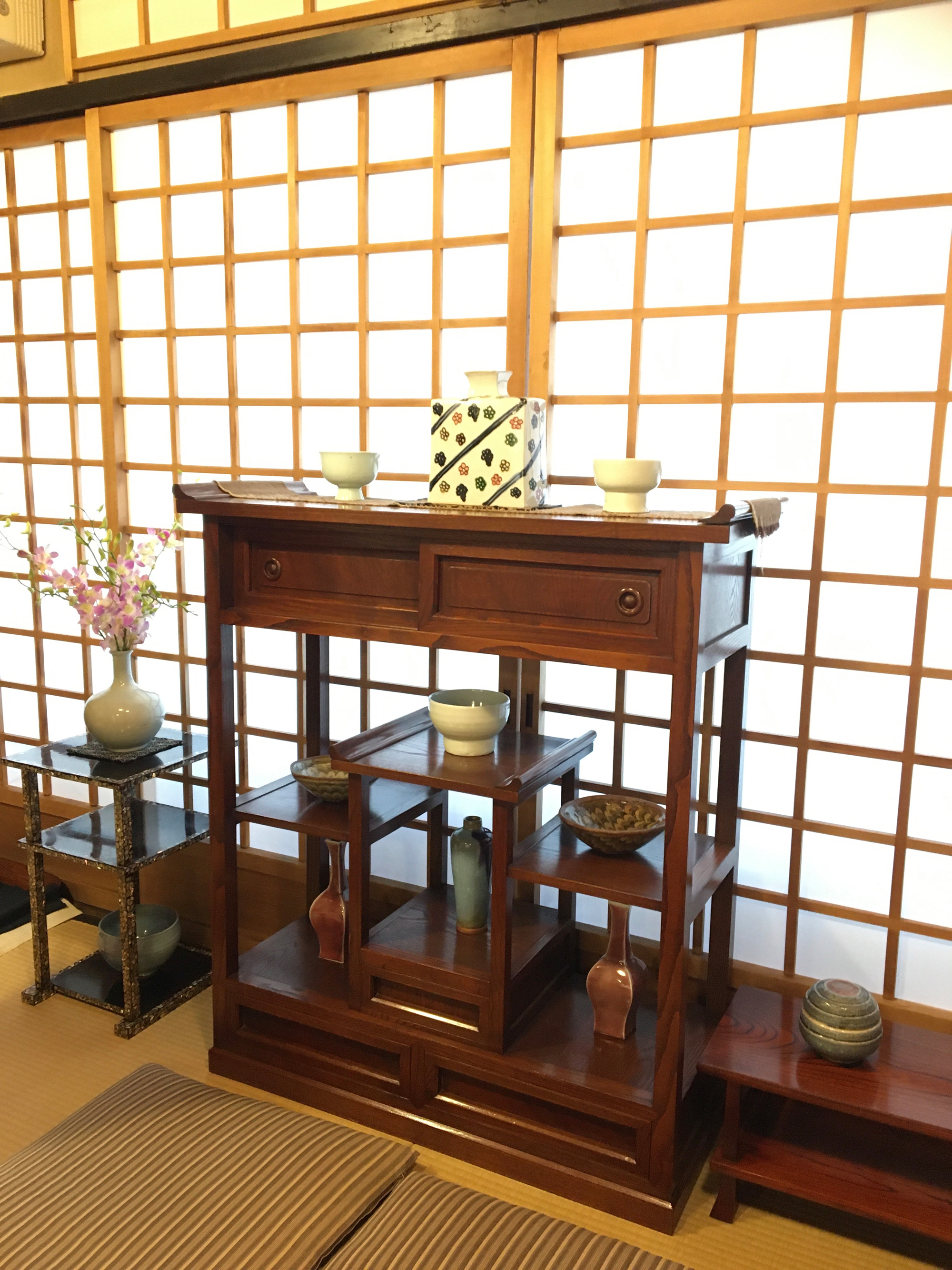 Hace algún tiempo, fuimos al restaurante Junidanya en Gion, Kioto. Este restaurante es famoso por haber inventado el shabu shabu (finas lonchas de ternera que se comen después de sumergirlas en agua hirviendo), pero también es conocido por ser un lugar de reunión de los principales miembros del movimiento Mingei y de destacadas figuras culturales de la época. Como aficionados al arte popular, siempre hemos querido visitar este restaurante al menos una vez.