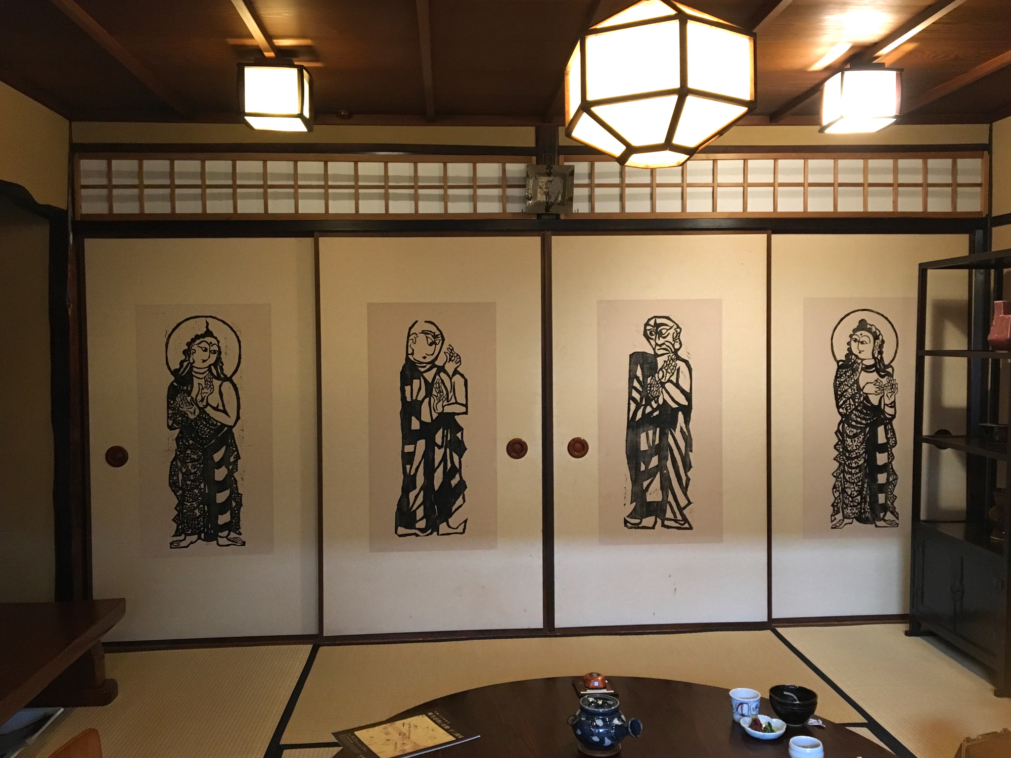 A continuación pasamos por las puertas correderas al segundo piso. La sala que nos enseñaron era muy cómoda, con luz que entraba por una gran ventana. La alcoba y las estanterías están decoradas con obras de cerámica de Kawai Kanjiro, Hamada Shoji y otros, y las puertas correderas también están adornadas con grabados de Munakata Shiko. Las puertas correderas suelen estar abiertas, pero cuando el dueño del restaurante supo que éramos aficionados al arte popular Mingei, tuvo la amabilidad de cerrar todas las puertas correderas para que pudiéramos ver todas las superficies de las puertas. Imaginando cómo Yanagi Muneyoshi y sus amigos del movimiento Mingei podrían haber discutido sus apasionados pensamientos en esta sala, al sumergirte en el espacio tienes la extraña sensación de estar dando un salto al pasado.